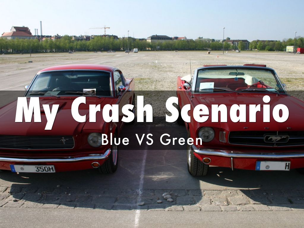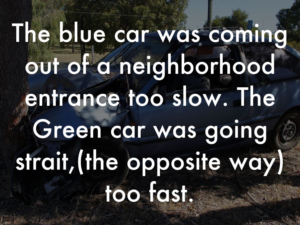 The blue car was coming out of a neighborhood entrance too slow. The Green car was going strait,(the opposite way) too fast.