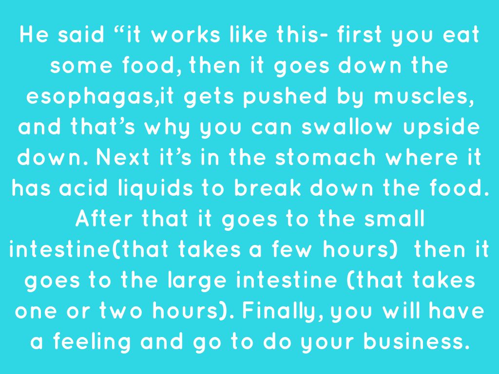 He said “it works like this- first you eat some food, then it goes down the esophagas,it gets pushed by muscles, and that’s why you can swallow upside down. Next it’s in the stomach where it has acid liquids to break down the food. After that it goes to the small intestine(that takes a few hours) then it goes to the large intestine (that takes one or two hours). Finally, you will have a feeling and go to do your business.