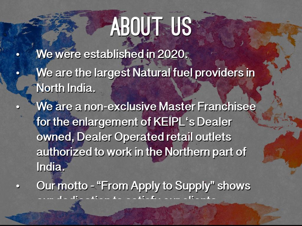 We are a non-exclusive Master Franchisee for the enlargement of KEIPL`s Dealer owned, Dealer Operated retail outlets authorized to work in the Northern part of India.
