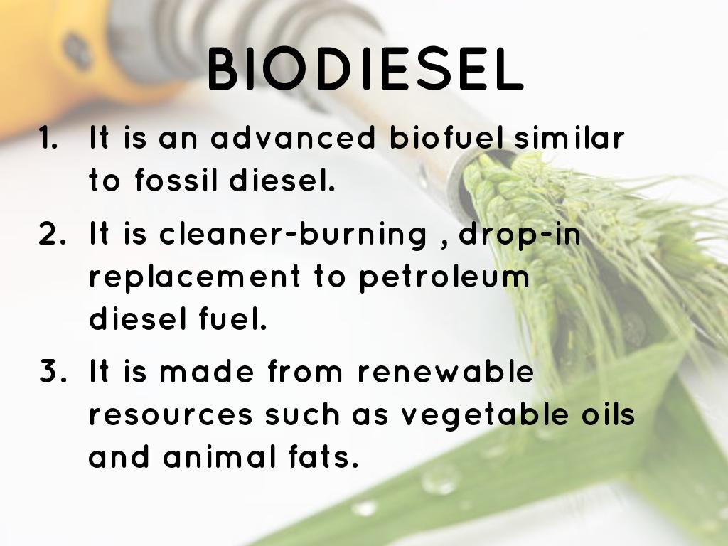 • It is cleaner-burning , drop-in replacement to petroleum diesel fuel.