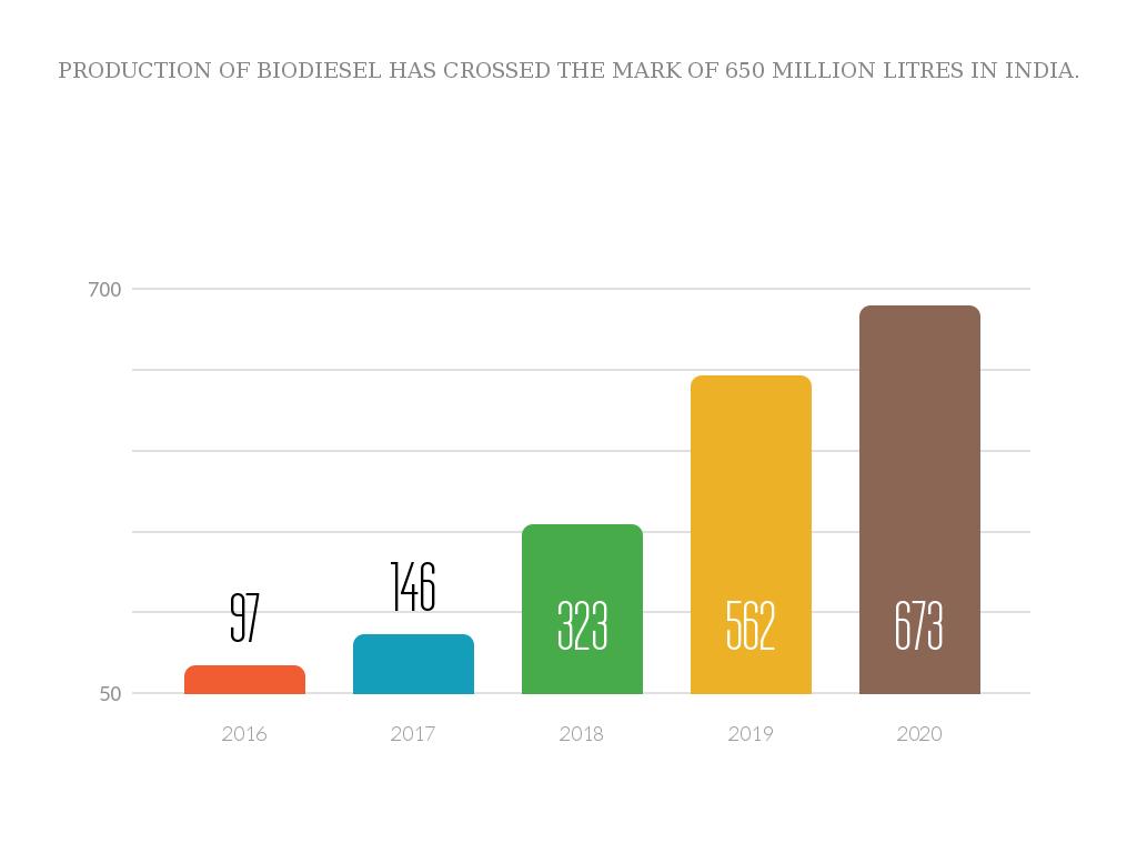 PRODUCTION OF BIODIESEL HAS CROSSED THE MARK OF 650 MILLION LITRES IN INDIA.