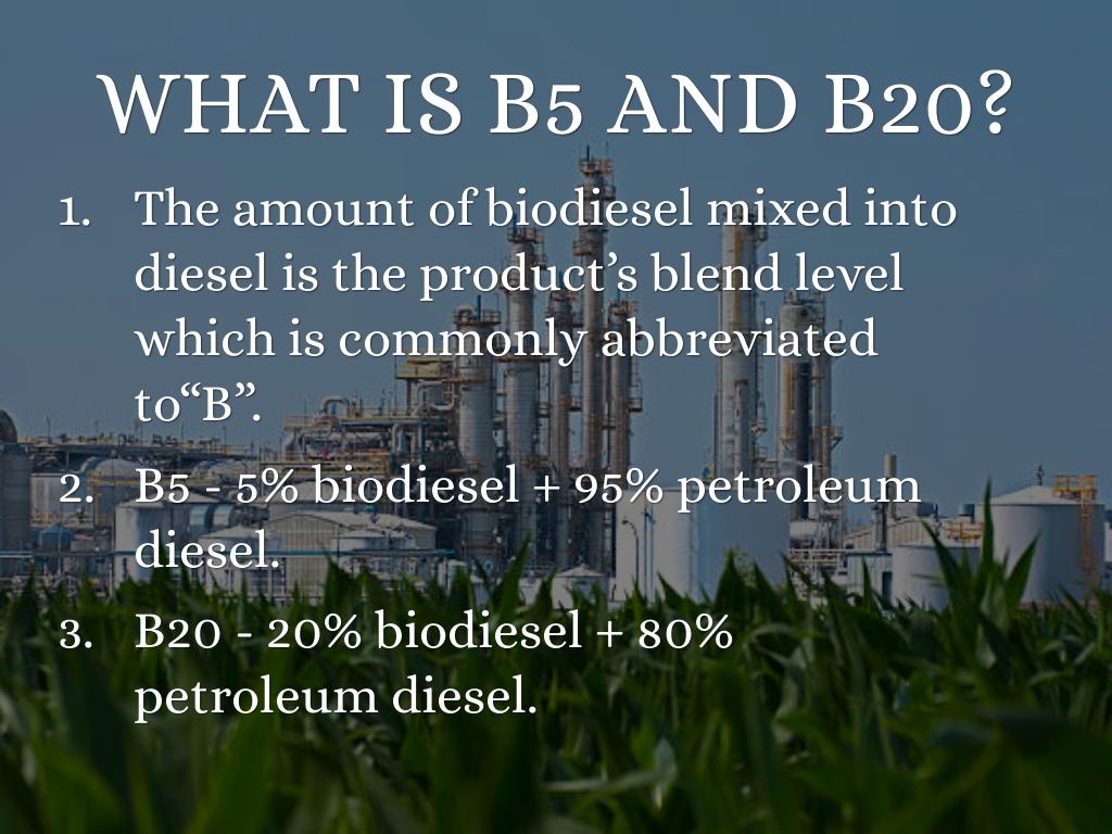• B5 - 5% biodiesel + 95% petroleum diesel.