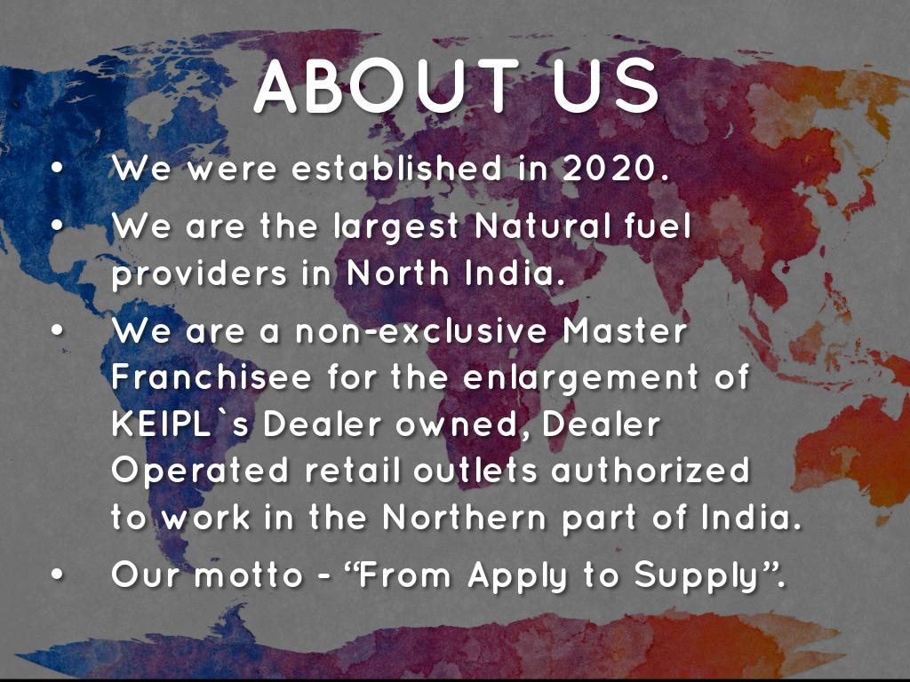 • We are a non-exclusive Master Franchisee for the enlargement of KEIPL`s Dealer owned, Dealer Operated retail outlets authorized to work in the Northern part of India.