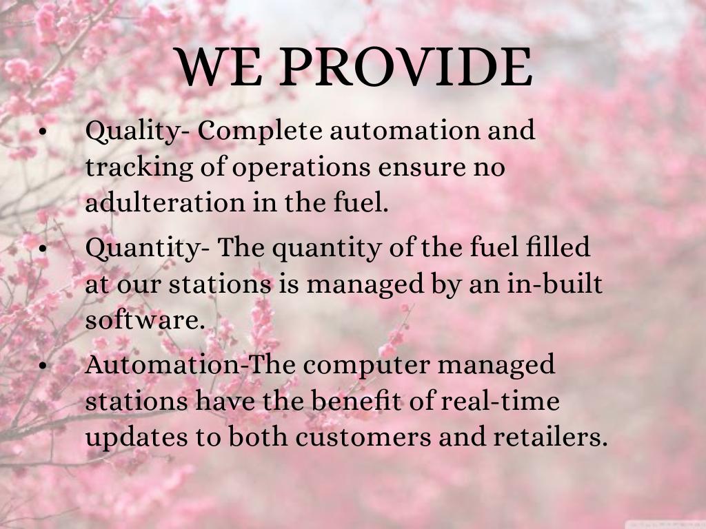 • Quantity- The quantity of the fuel filled at our stations is managed by an in-built software.