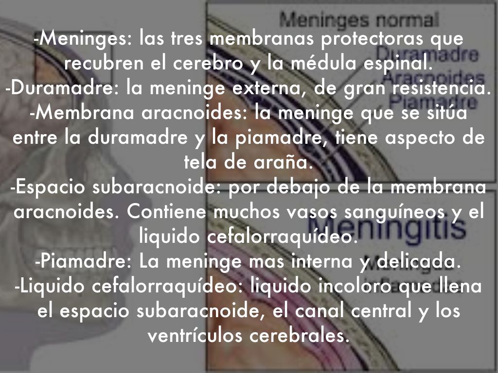 -Meninges: las tres membranas protectoras que recubren el cerebro y la médula espinal.