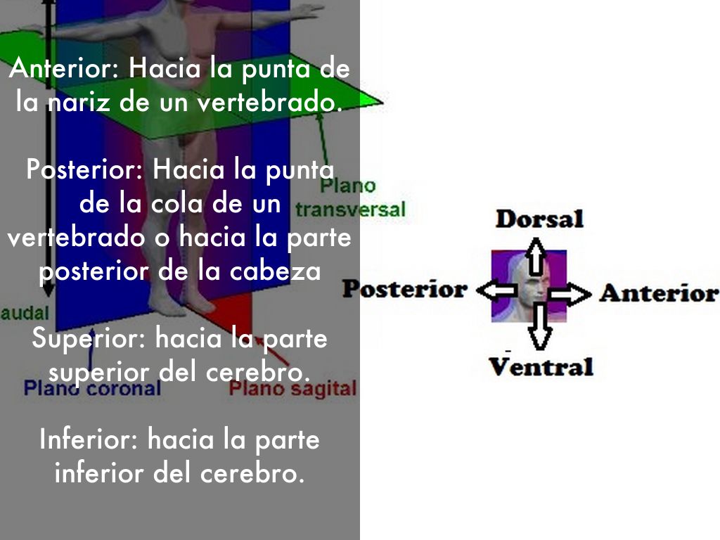 Dorsal: hacia la superficie de la espalda de un vertebrado o hacia la parte superior de la cabeza.