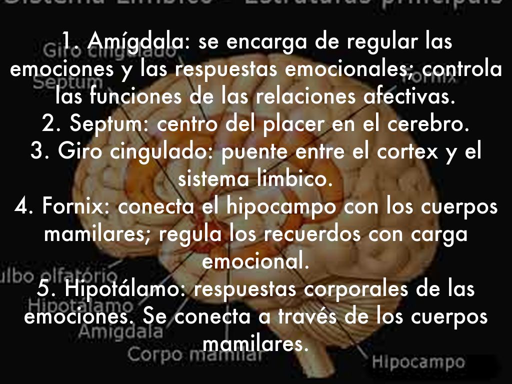 1. Amígdala: se encarga de regular las emociones y las respuestas emocionales; controla las funciones de las relaciones afectivas.