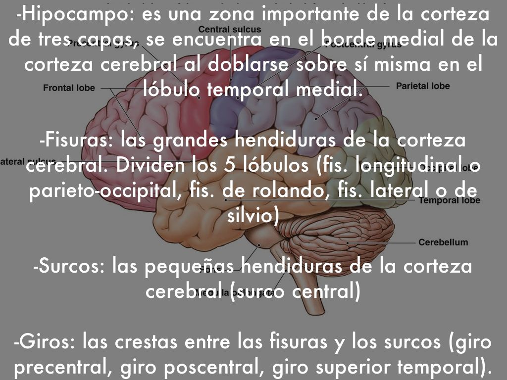 -Giros: las crestas entre las fisuras y los surcos (giro precentral, giro poscentral, giro superior temporal).