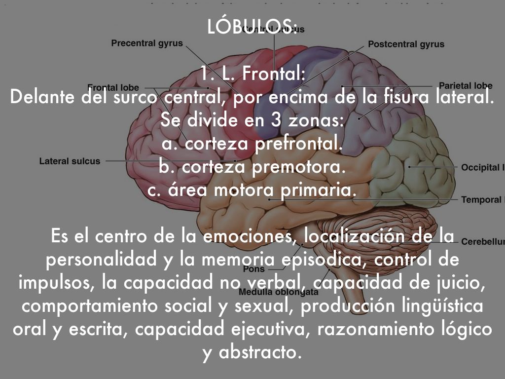 Es el centro de la emociones, localización de la personalidad y la memoria episodica, control de impulsos, la capacidad no verbal, capacidad de juicio, comportamiento social y sexual, producción lingüística oral y escrita, capacidad ejecutiva, razonamiento lógico y abstracto.