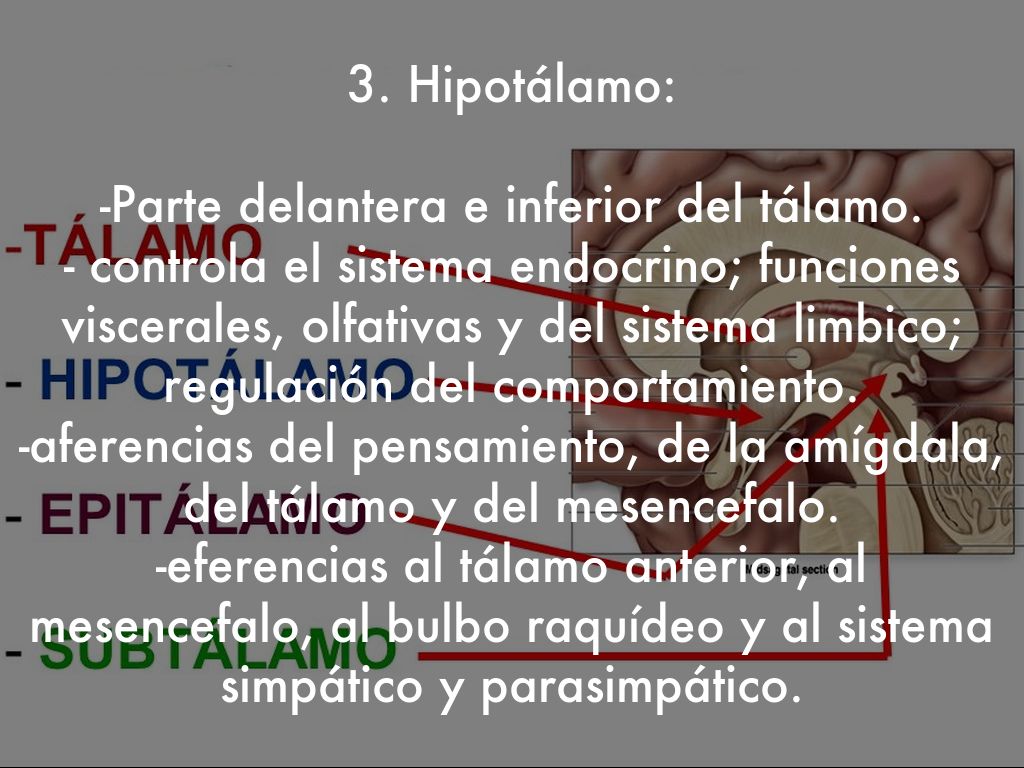 - controla el sistema endocrino; funciones viscerales, olfativas y del sistema limbico; regulación del comportamiento.