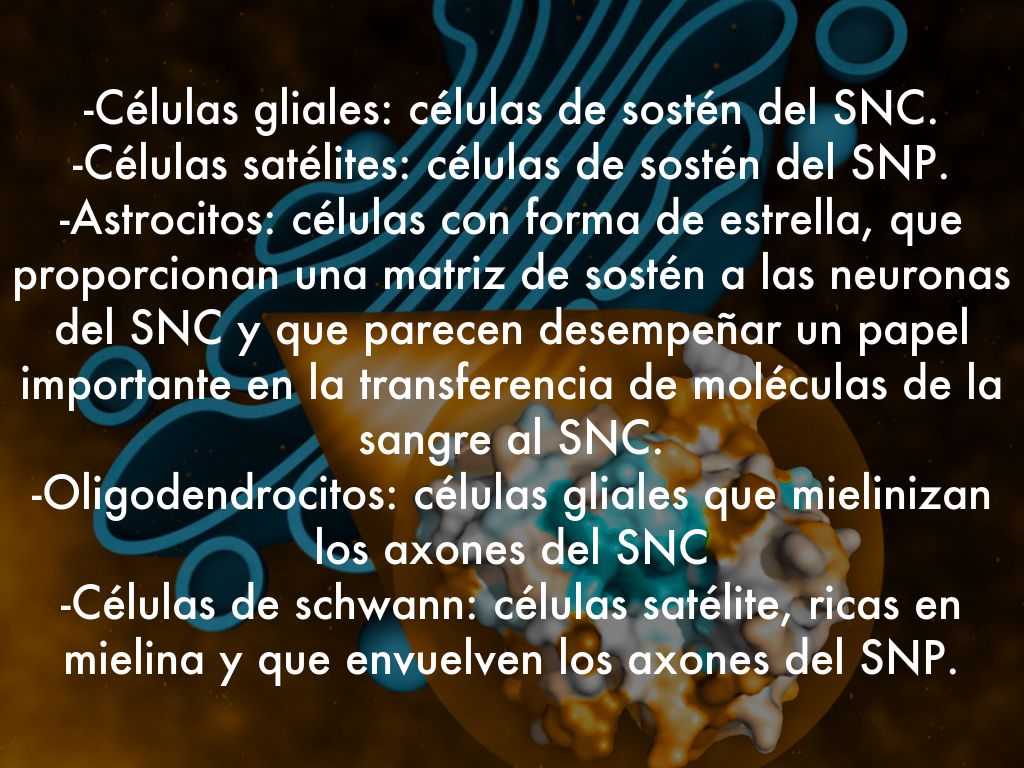 -Astrocitos: células con forma de estrella, que proporcionan una matriz de sostén a las neuronas del SNC y que parecen desempeñar un papel importante en la transferencia de moléculas de la sangre al SNC.