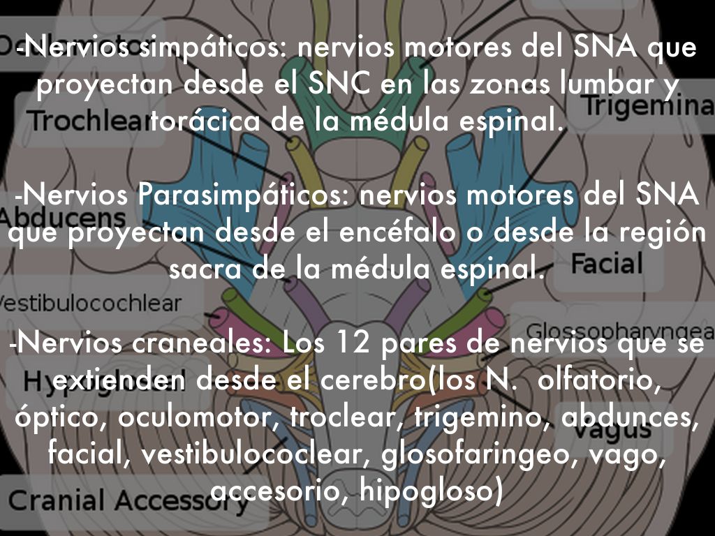 -Nervios simpáticos: nervios motores del SNA que proyectan desde el SNC en las zonas lumbar y torácica de la médula espinal.