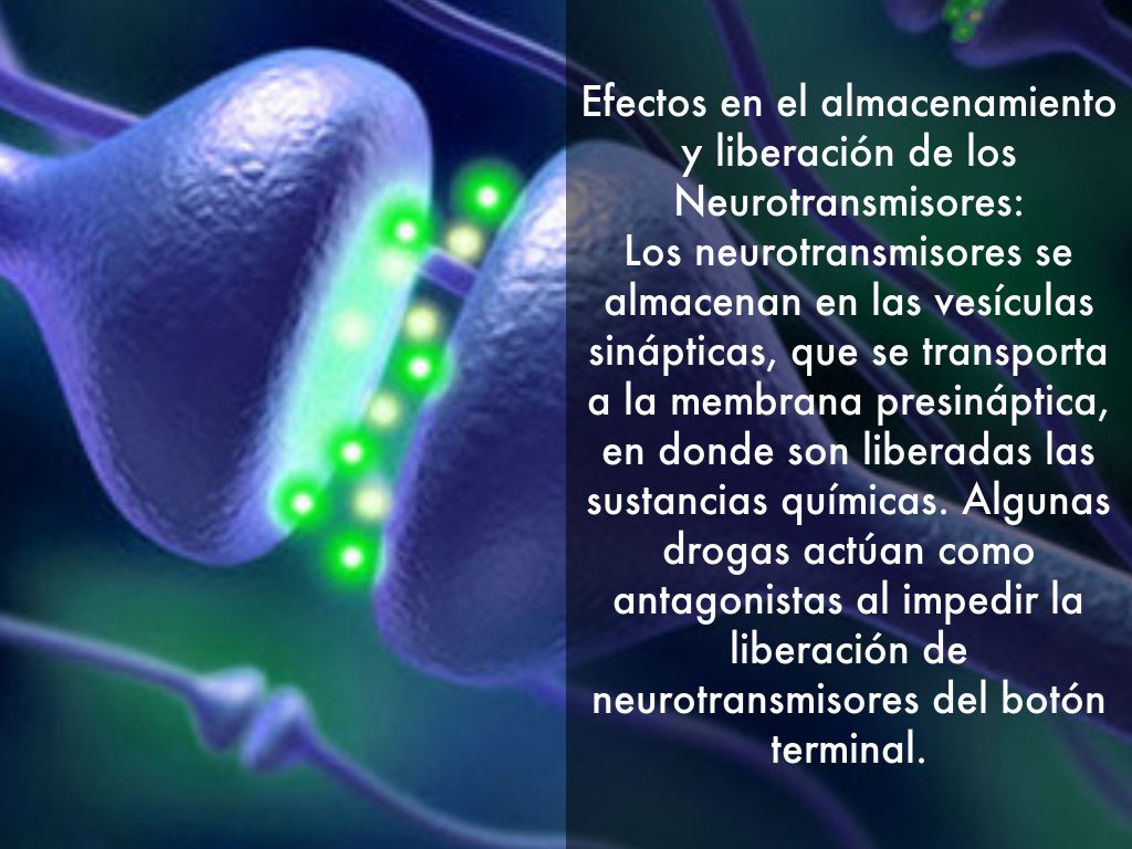 Los neurotransmisores se almacenan en las vesículas sinápticas, que se transporta a la membrana presináptica, en donde son liberadas las sustancias químicas. Algunas drogas actúan como antagonistas al impedir la liberación de neurotransmisores del botón terminal.