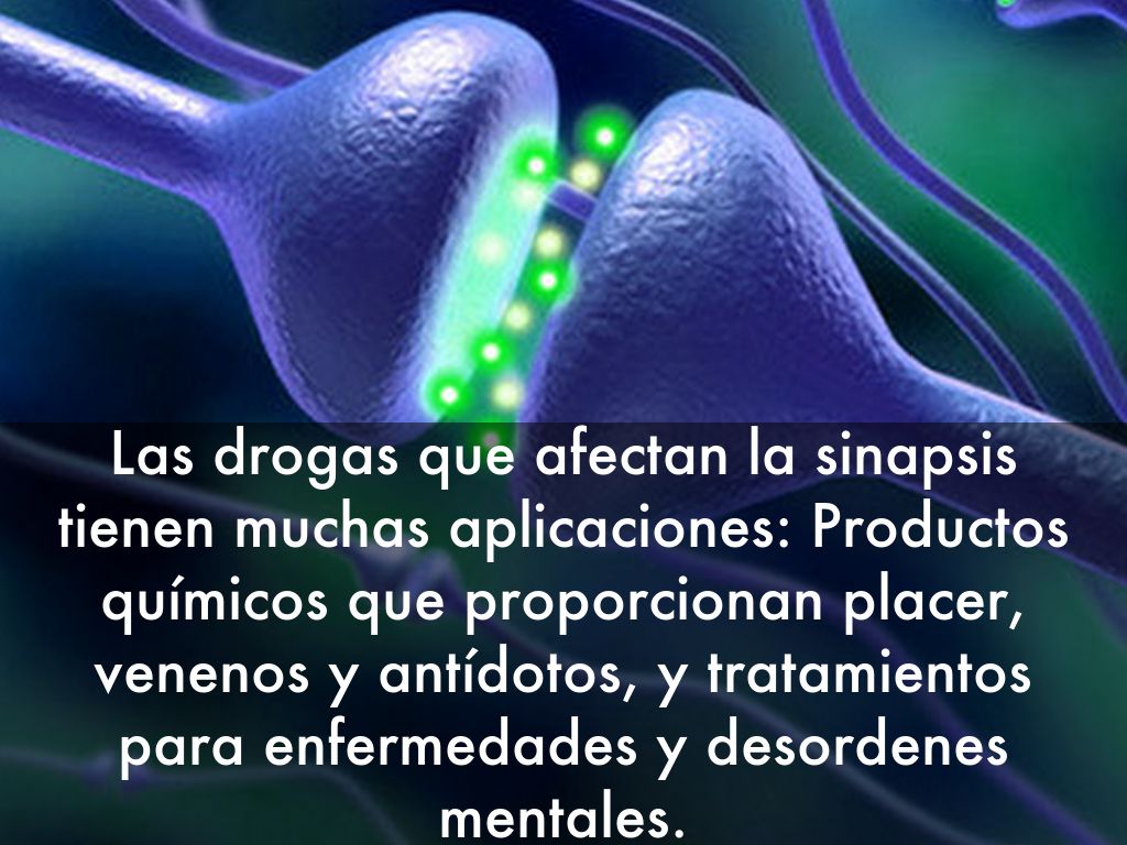 Las drogas que afectan la sinapsis tienen muchas aplicaciones: Productos químicos que proporcionan placer, venenos y antídotos, y tratamientos para enfermedades y desordenes mentales.