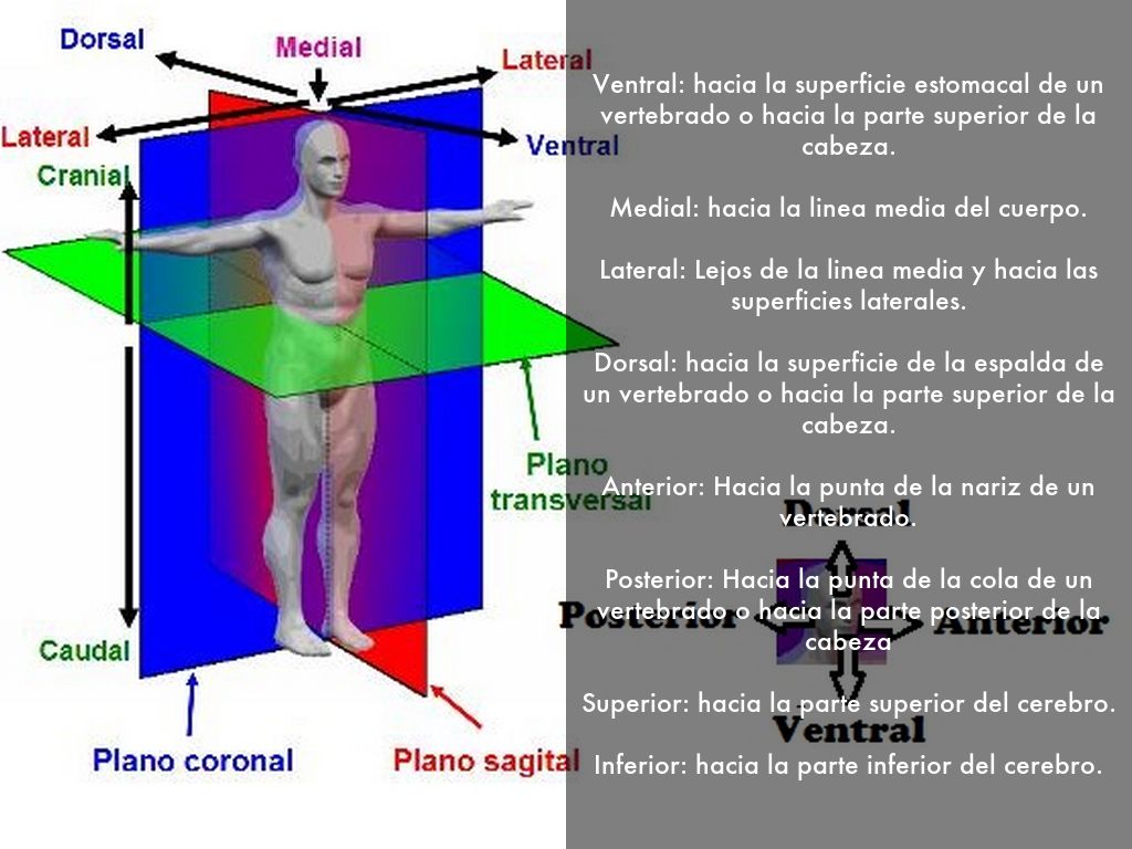 Ventral: hacia la superficie estomacal de un vertebrado o hacia la parte superior de la cabeza.