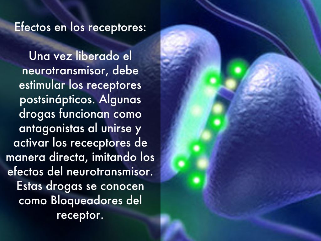 Una vez liberado el neurotransmisor, debe estimular los receptores postsinápticos. Algunas drogas funcionan como antagonistas al unirse y activar los rececptores de manera directa, imitando los efectos del neurotransmisor. Estas drogas se conocen como Bloqueadores del receptor.