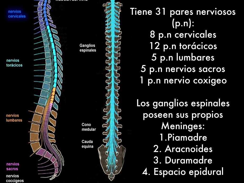 Se aloja desde el foramen mágnum hasta el borde superior de la segunda vertebra lumbar L2, aparir de L3 inicia la denominada cauda equina. Tiene forma cilíndrica y es de aspecto blancoso.