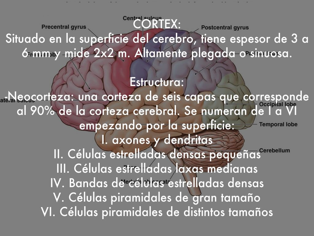 Situado en la superficie del cerebro, tiene espesor de 3 a 6 mm y mide 2x2 m. Altamente plegada o sinuosa.