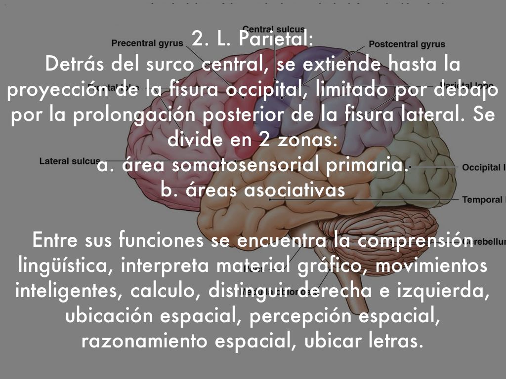 Detrás del surco central, se extiende hasta la proyección de la fisura occipital, limitado por debajo por la prolongación posterior de la fisura lateral. Se divide en 2 zonas: