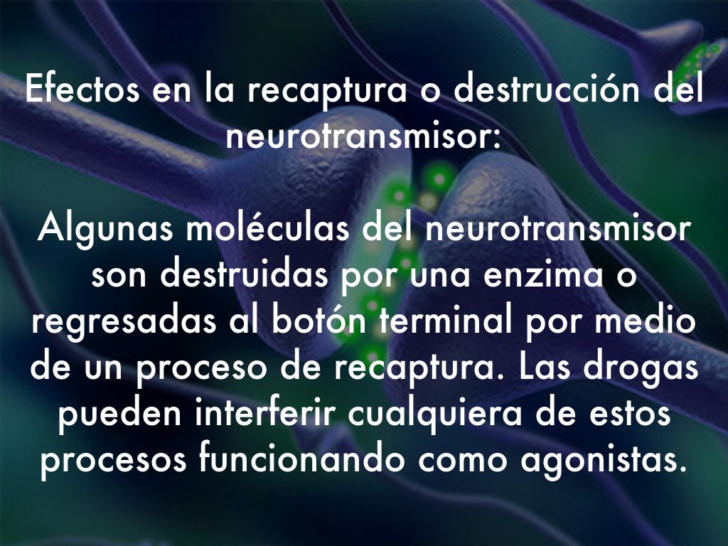 Algunas moléculas del neurotransmisor son destruidas por una enzima o regresadas al botón terminal por medio de un proceso de recaptura. Las drogas pueden interferir cualquiera de estos procesos funcionando como agonistas.