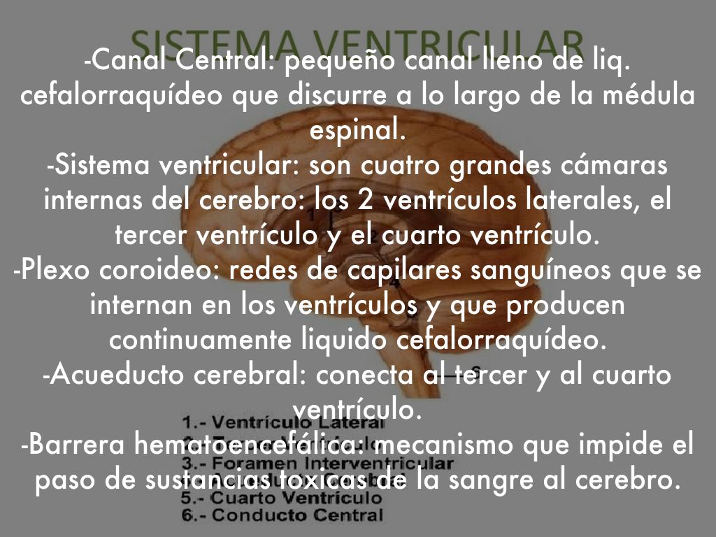 -Plexo coroideo: redes de capilares sanguíneos que se internan en los ventrículos y que producen continuamente liquido cefalorraquídeo.