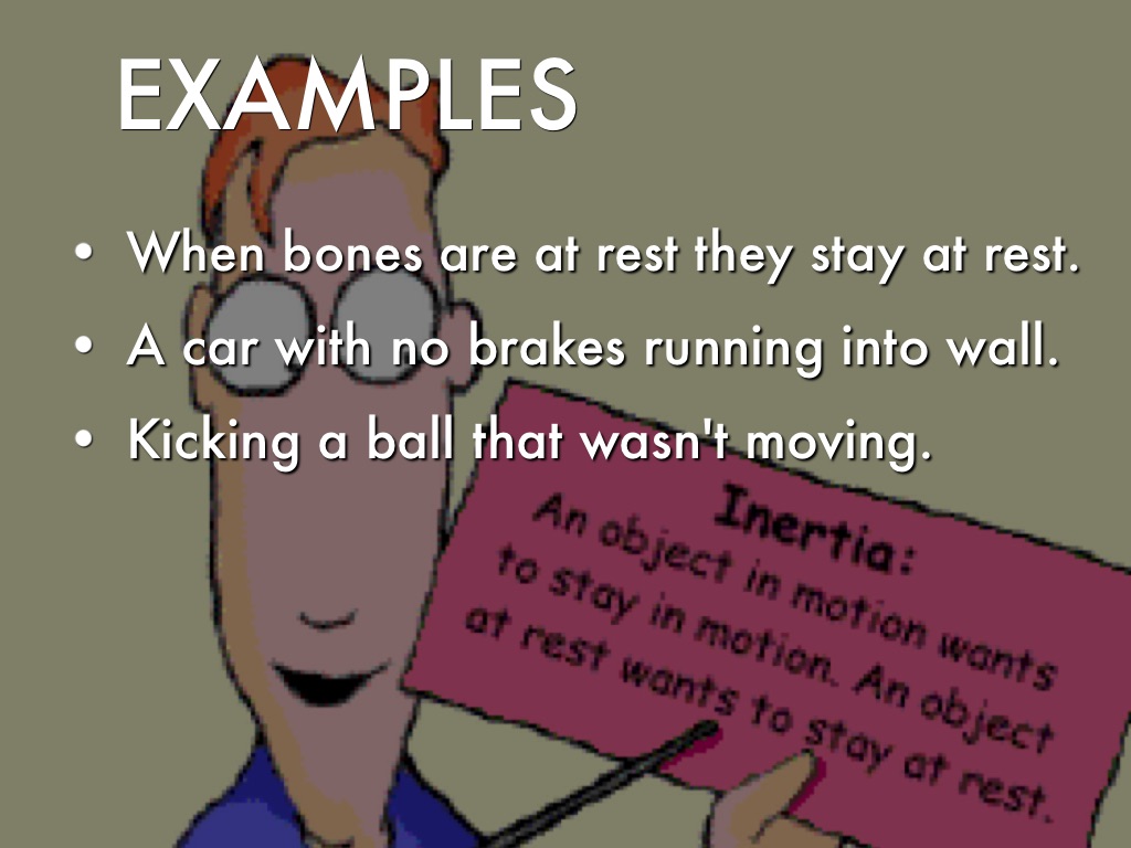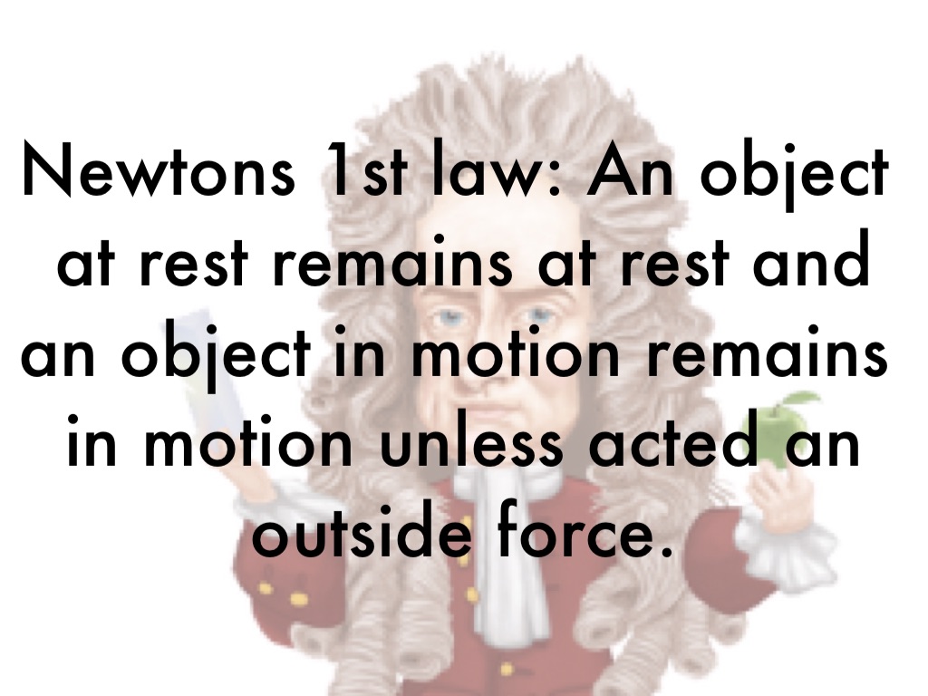 Newtons 1st law: An object at rest remains at rest and an object in motion remains in motion unless acted an outside force.
