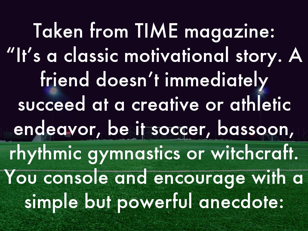 Taken from TIME magazine: “It’s a classic motivational story. A friend doesn’t immediately succeed at a creative or athletic endeavor, be it soccer, bassoon, rhythmic gymnastics or witchcraft. You console and encourage with a simple but powerful anecdote: