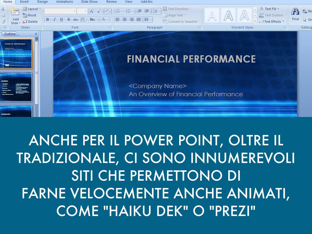 ANCHE PER IL POWER POINT, OLTRE IL TRADIZIONALE, CI SONO INNUMEREVOLI SITI CHE PERMETTONO DI FARNE VELOCEMENTE ANCHE ANIMATI, COME "HAIKU DEK" O "PREZI"