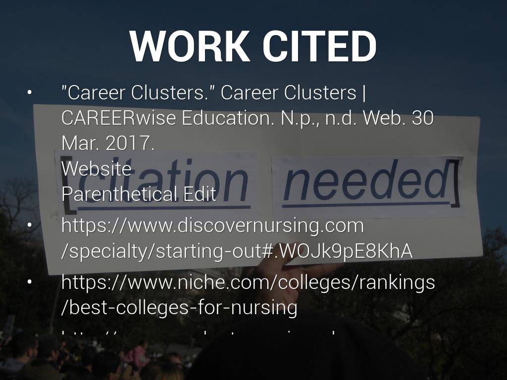 "Career Clusters." Career Clusters | CAREERwise Education. N.p., n.d. Web. 30 Mar. 2017. Website Parenthetical Edit