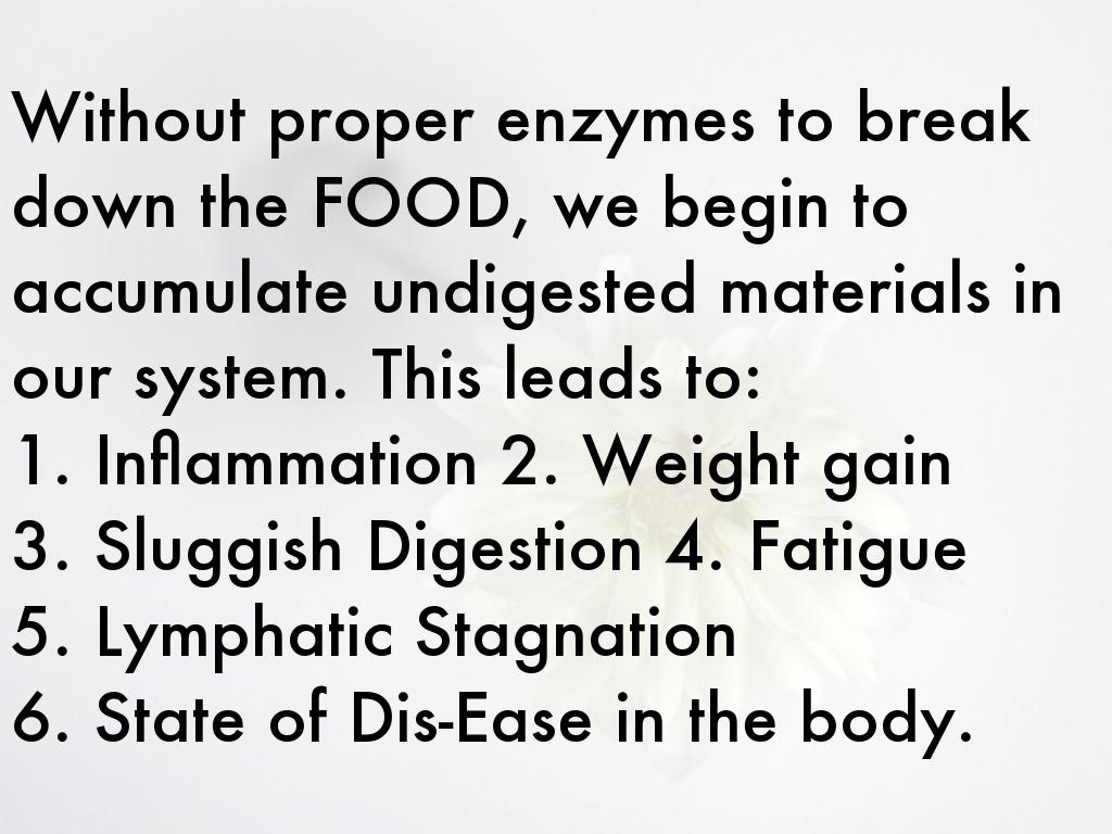 Without proper enzymes to break down the FOOD, we begin to accumulate undigested materials in our system. This leads to: