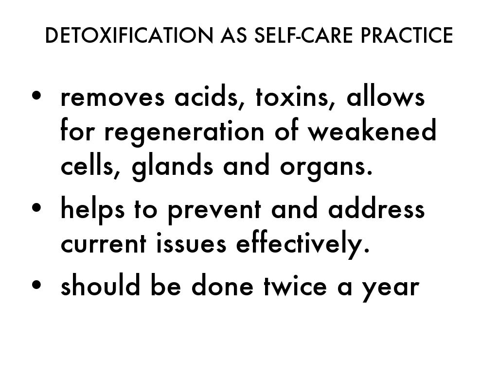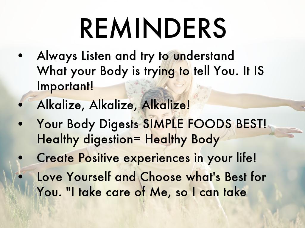 • ALKALIZING - Rest, sufficient Sleep, Fresh Air, Walking, Laughter,Being out in the Nature, Deep Breathing, Self-Care and Self-Love, Yoga & moderate Exercise,Having genuine meaningful Relationships, Forgiveness, Gratitude, Non-judgement.