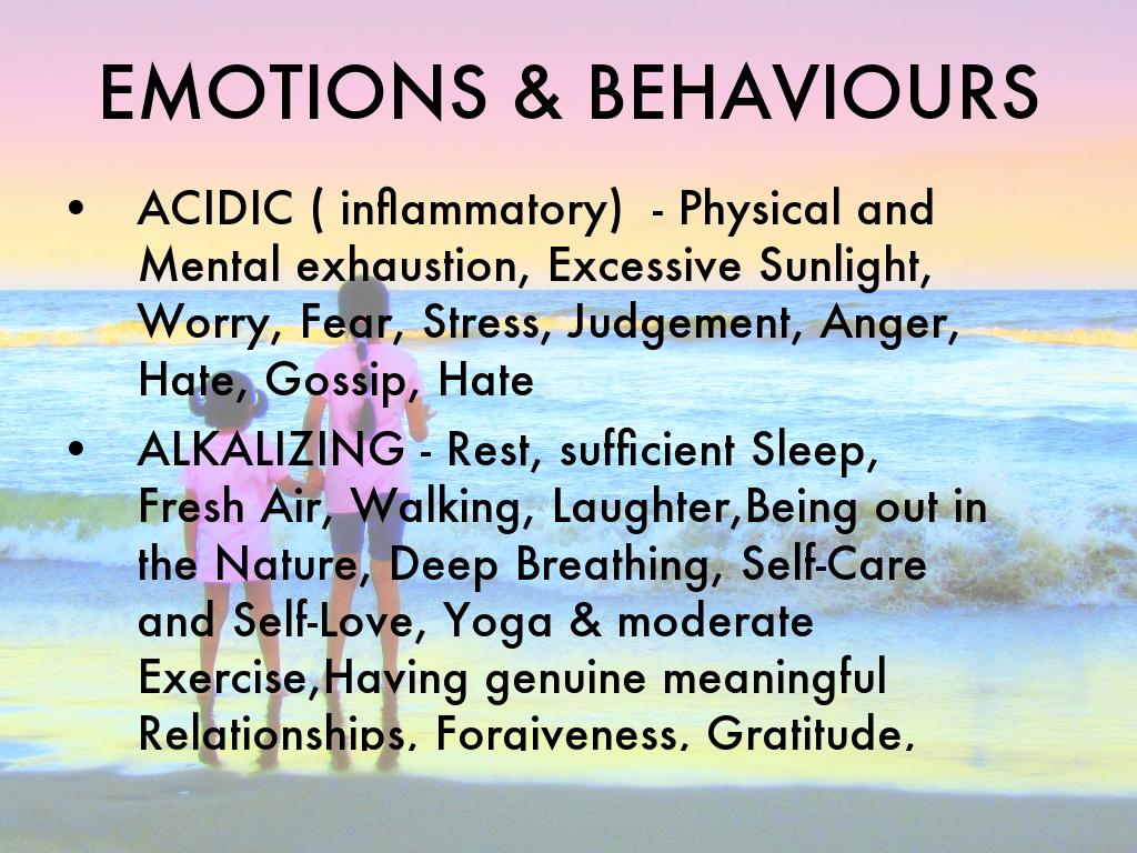 • ACIDIC ( inflammatory) - Physical and Mental exhaustion, Excessive Sunlight, Worry, Fear, Stress, Judgement, Anger, Hate, Gossip, Hate