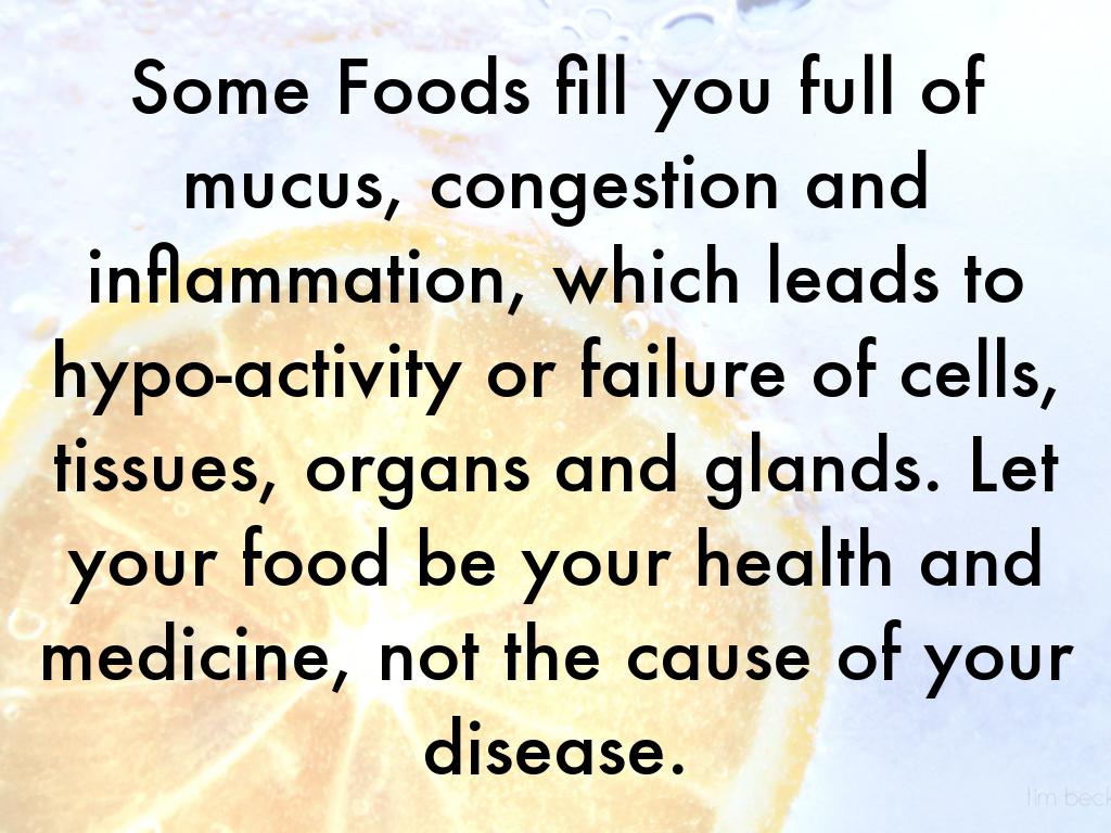 Some Foods fill you full of mucus, congestion and inflammation, which leads to hypo-activity or failure of cells, tissues, organs and glands. Let your food be your health and medicine, not the cause of your disease.
