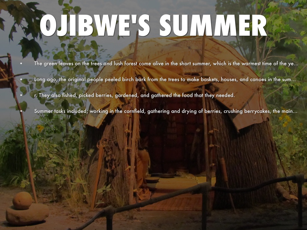 Summer tasks included; working in the cornfield, gathering and drying of berries, crushing berrycakes, the main source of all winter nutrients -- especially vitamin C -- not supplied by meat and grain. There are raspberries, cranberries, blueberries, sarsaparilla vine (wabos odjibik mean rabbit root) and
