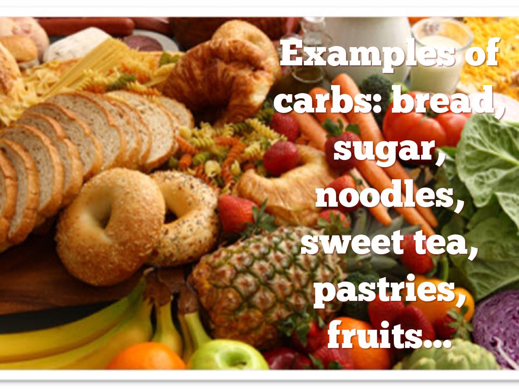 Examples of carbs: bread, sugar, noodles, sweet tea, pastries, fruits...