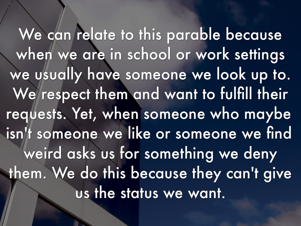 We can relate to this parable because when we are in school or work settings we usually have someone we look up to. We respect them and want to fulfill their requests. Yet, when someone who maybe isn't someone we like or someone we find weird asks us for something we deny them. We do this because they can't give us the status we want.