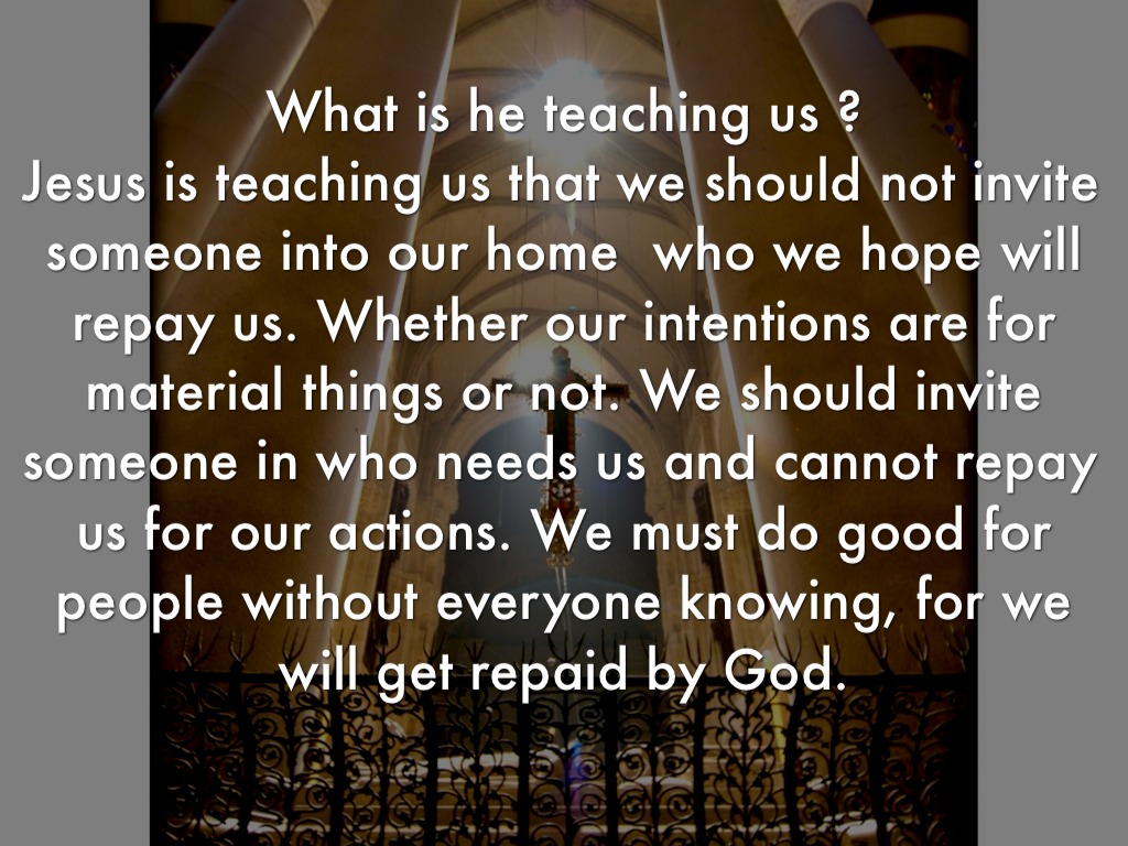 What is he teaching us ? Jesus is teaching us that we should not invite someone into our home who we hope will repay us. Whether our intentions are for material things or not. We should invite someone in who needs us and cannot repay us for our actions. We must do good for people without everyone knowing, for we will get repaid by God.
