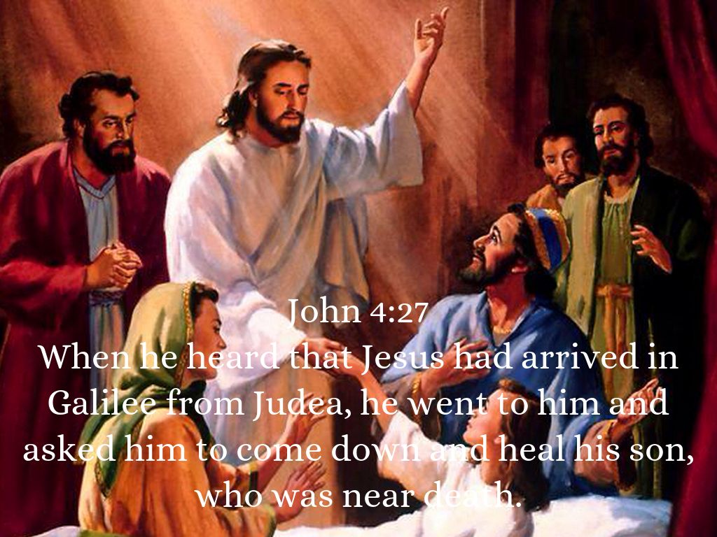 When he heard that Jesus had arrived in Galilee from Judea, he went to him and asked him to come down and heal his son, who was near death.