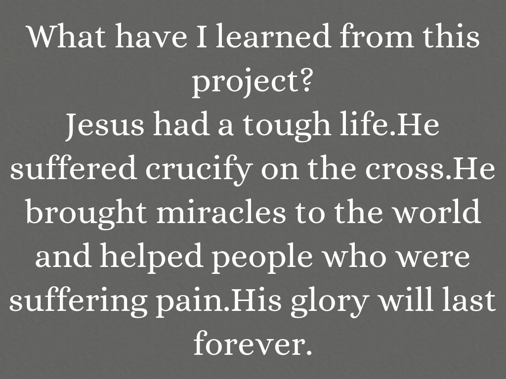 Jesus had a tough life.He suffered crucify on the cross.He brought miracles to the world and helped people who were suffering pain.His glory will last forever.