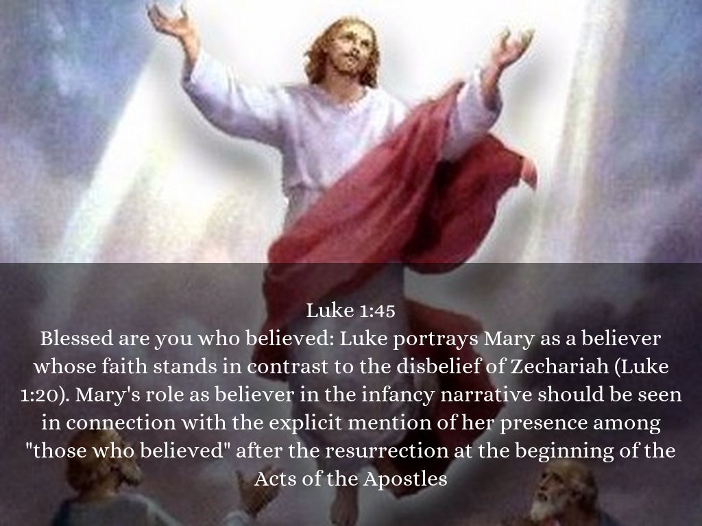 Blessed are you who believed: Luke portrays Mary as a believer whose faith stands in contrast to the disbelief of Zechariah (Luke 1:20). Mary's role as believer in the infancy narrative should be seen in connection with the explicit mention of her presence among "those who believed" after the resurrection at the beginning of the Acts of the Apostles