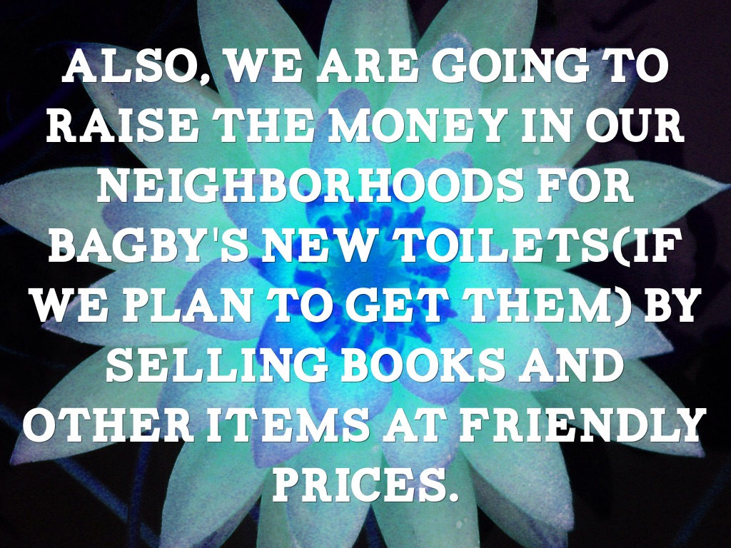 Also, we are going to raise the money in our neighborhoods for Bagby's new toilets(if we plan to get them) by selling books and other items at friendly prices.
