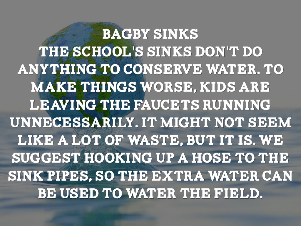 The school's sinks don't do anything to conserve water. To make things worse, kids are leaving the faucets running unnecessarily. It might not seem like a lot of waste, but it is. We suggest hooking up a hose to the sink pipes, so the extra water can be used to water the field.