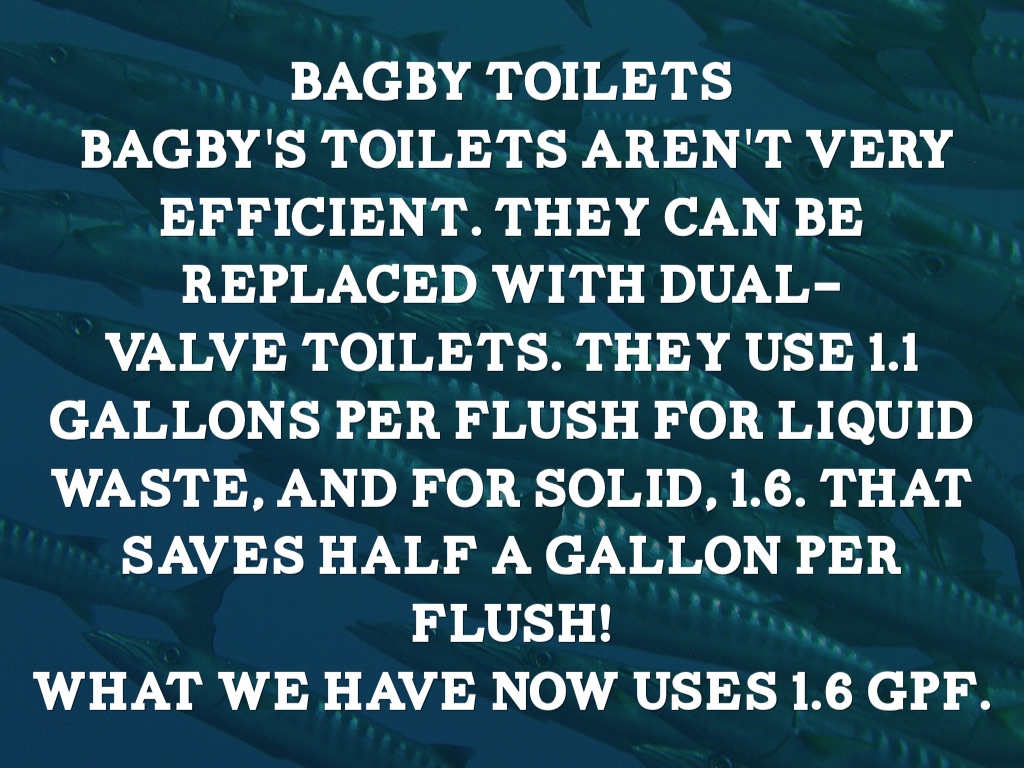 Bagby's toilets aren't very efficient. They can be replaced with Dual-