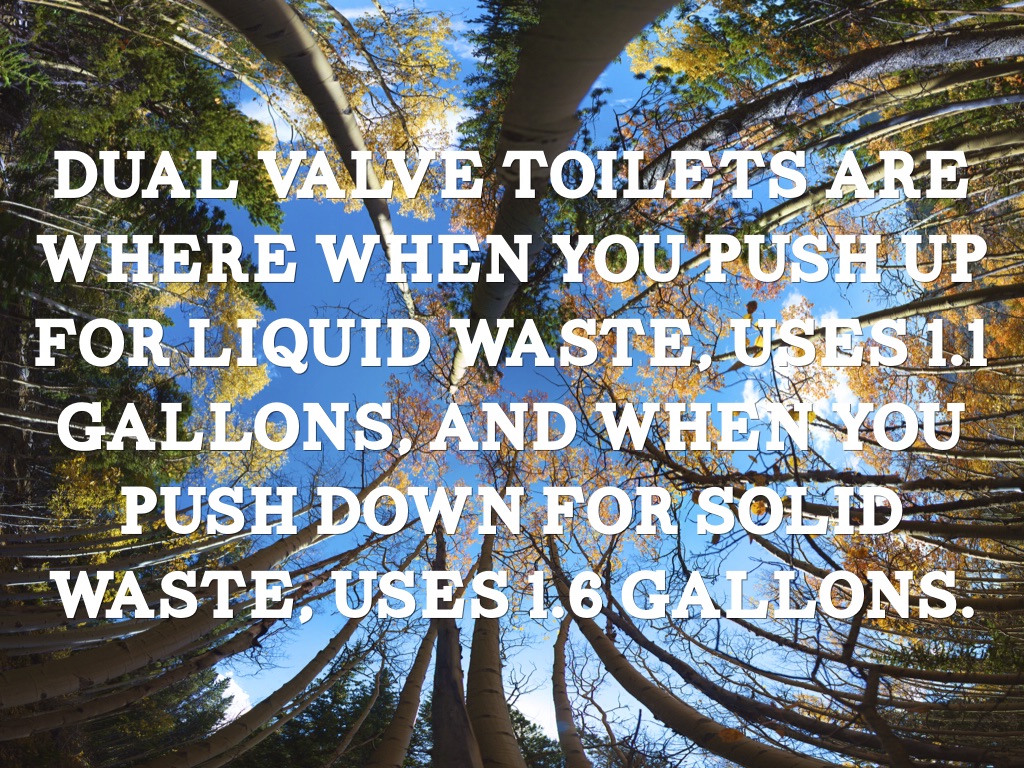 Dual valve toilets are where when you push up for liquid waste, uses 1.1 gallons, and when you push down for solid waste, uses 1.6 gallons.