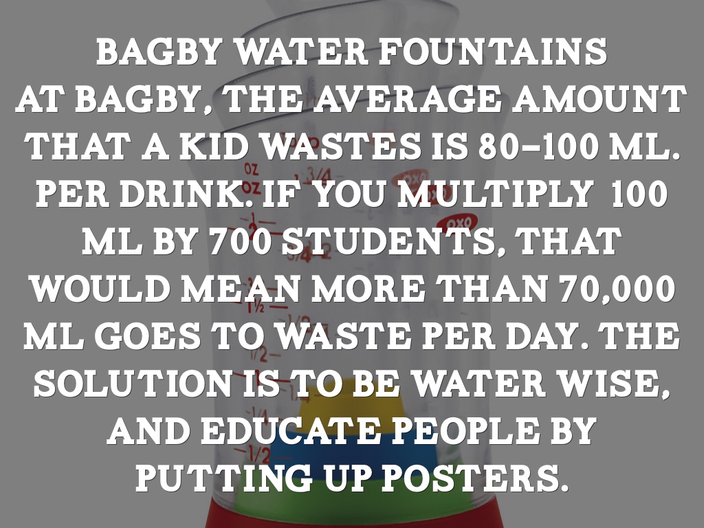 At Bagby, the average amount that a kid wastes is 80-100 ml. per drink. If you multiply 100 ml by 700 students, that would mean more than 70,000 ml goes to waste per day. The solution is to be water wise, and educate people by putting up posters.