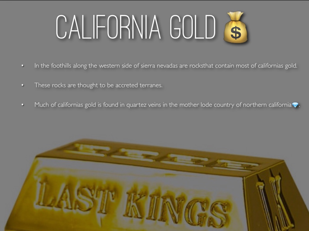 Much of californias gold is found in quartez veins in the mother lode country of northern california💎.