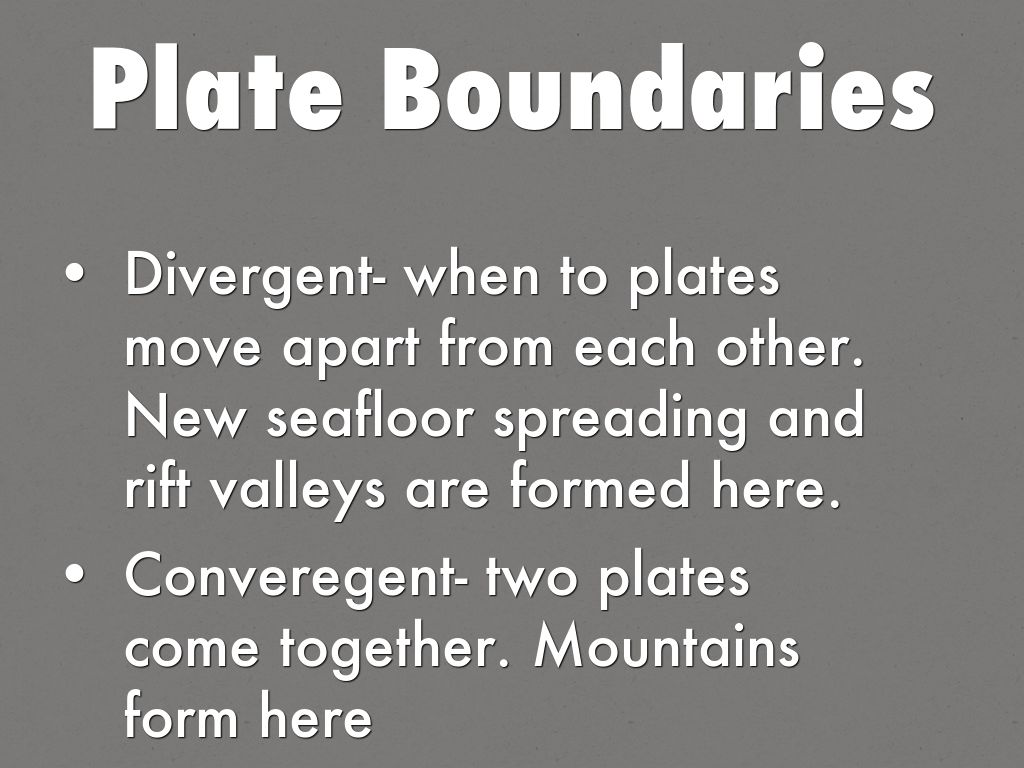 • Divergent- when to plates move apart from each other. New seafloor spreading and rift valleys are formed here.