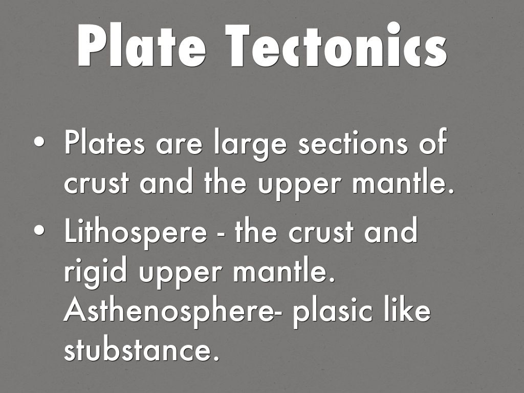 • Lithospere - the crust and rigid upper mantle. Asthenosphere- plasic like stubstance.