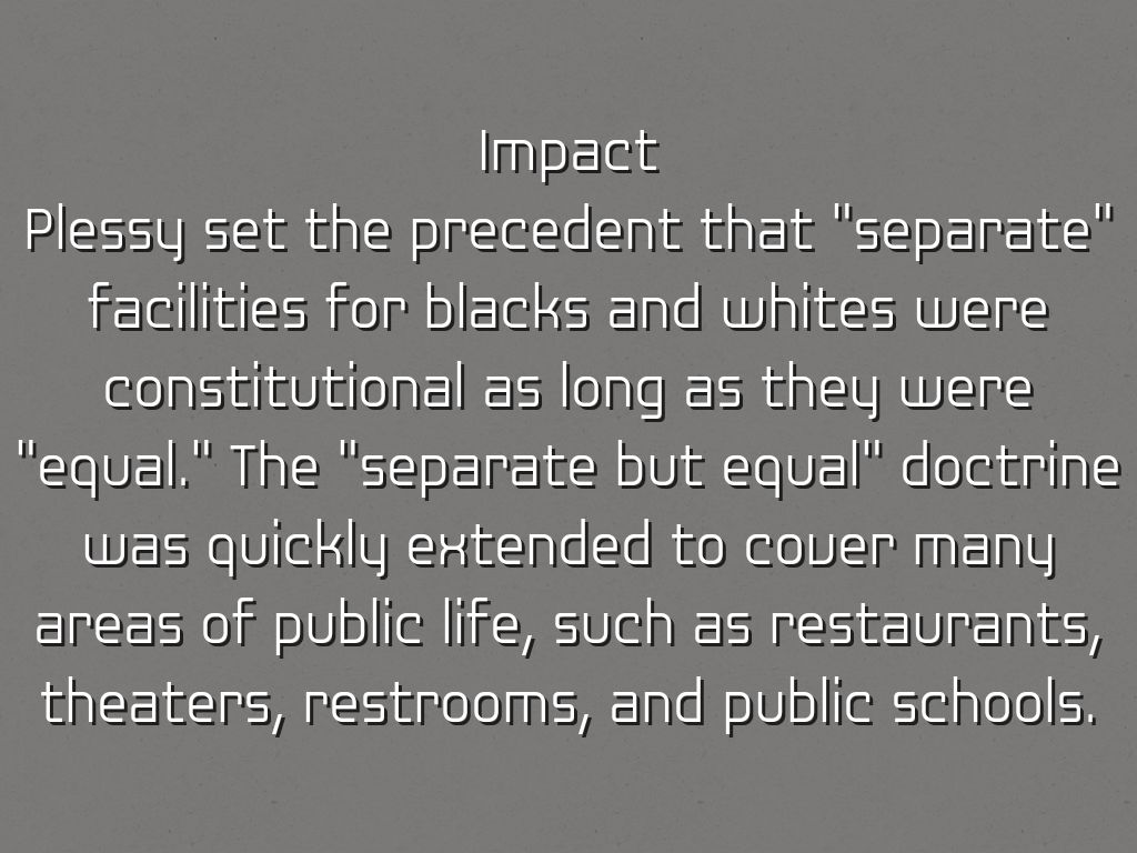 Plessy set the precedent that "separate" facilities for blacks and whites were constitutional as long as they were "equal." The "separate but equal" doctrine was quickly extended to cover many areas of public life, such as restaurants, theaters, restrooms, and public schools.