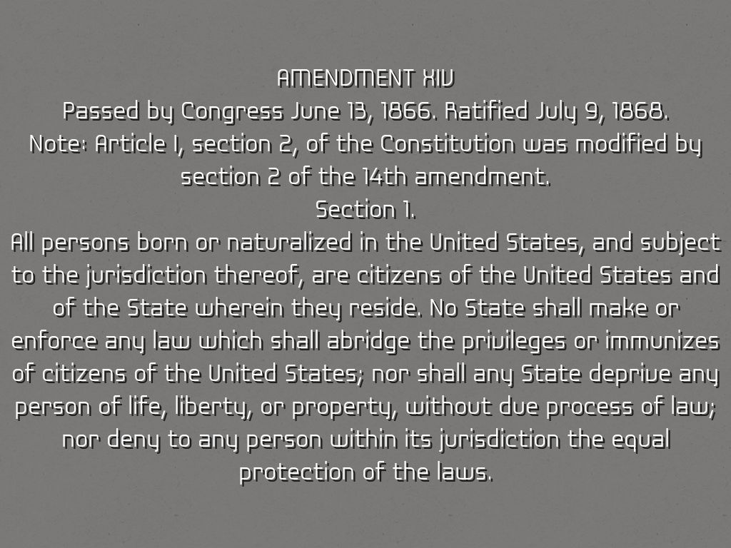 All persons born or naturalized in the United States, and subject to the jurisdiction thereof, are citizens of the United States and of the State wherein they reside. No State shall make or enforce any law which shall abridge the privileges or immunizes of citizens of the United States; nor shall any State deprive any person of life, liberty, or property, without due process of law; nor deny to any person within its jurisdiction the equal protection of the laws.